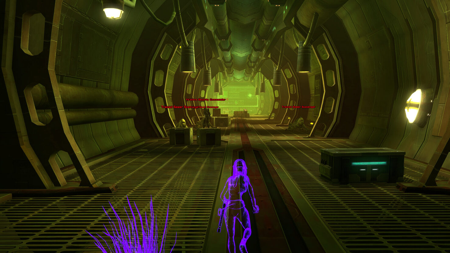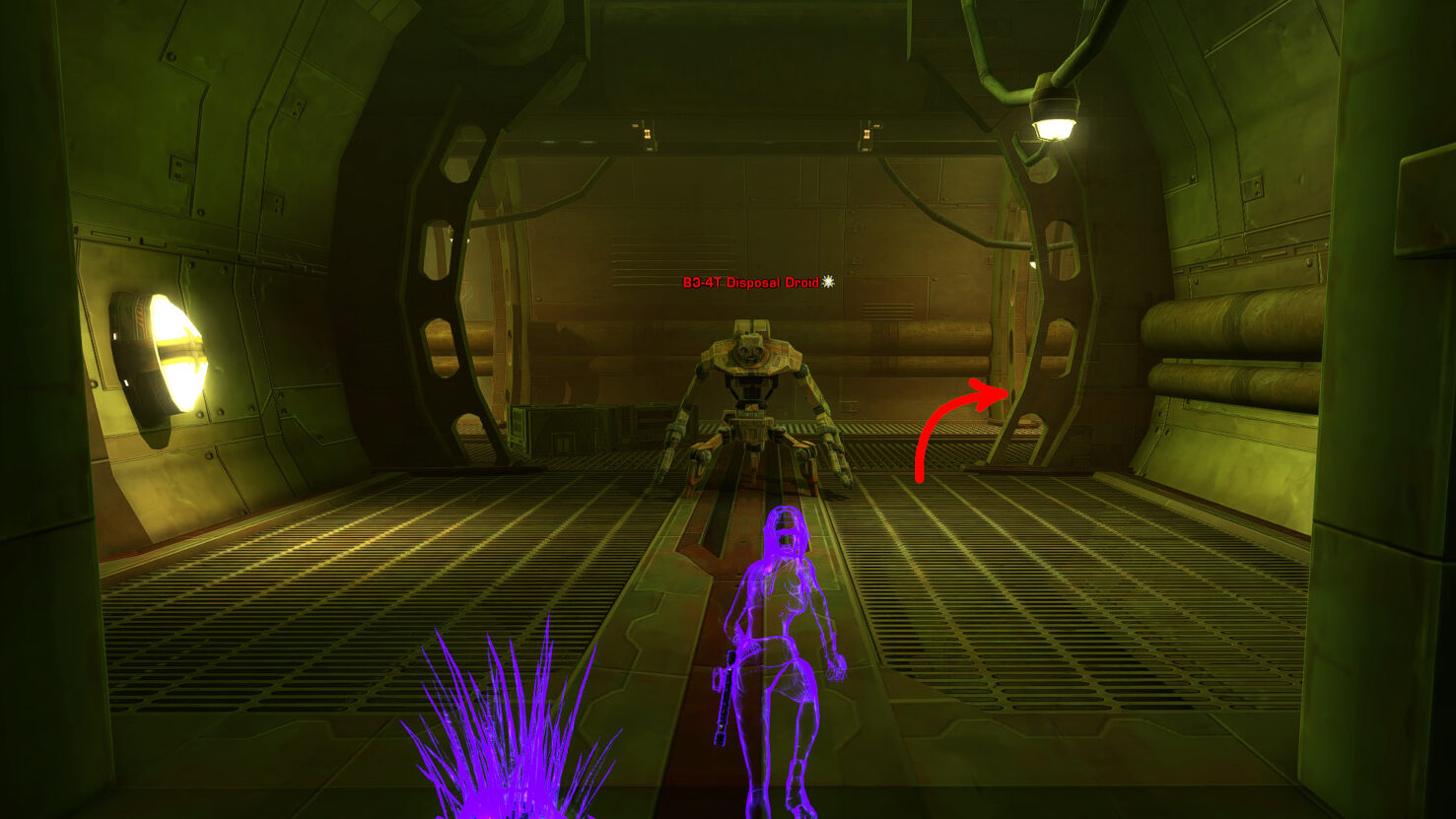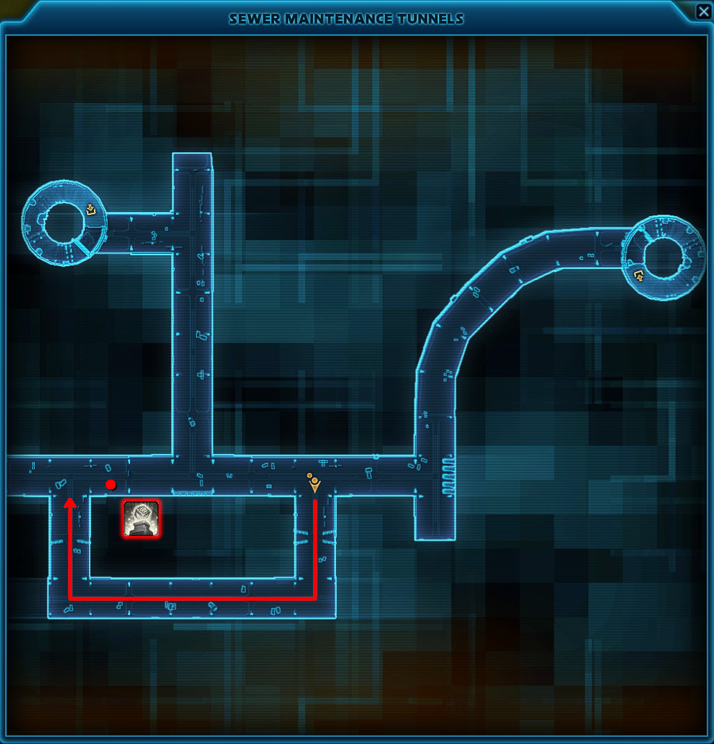 Instead of taking the path that leads out of the sewers again, you have to turn right and follow the path to the dead end where the Datacron is located, guarded by a Champion Droid called B3-4T Disposal Droid.
