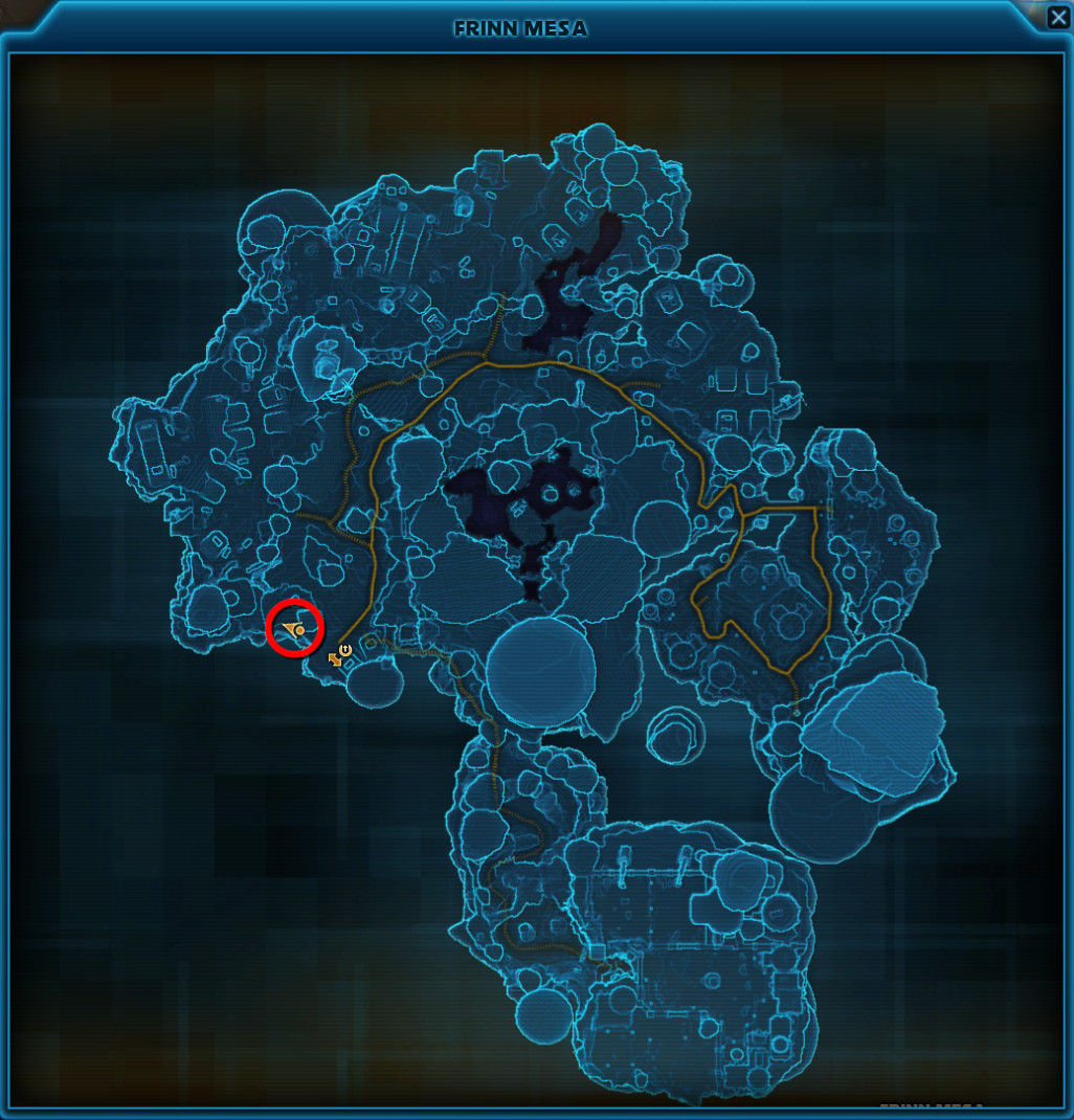 This is a very long and unforgiving jumping puzzle, so take your time. The Endurance Datacron is located on a platform overlooking the drills drilling into the core. Your starting point is right next to the Republic Outpost on the west side of Frinn Mesa, and therefore I recommend doing this on a Republic Character so your starting point is close in case you fail the jumps.