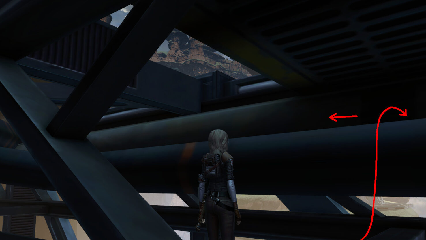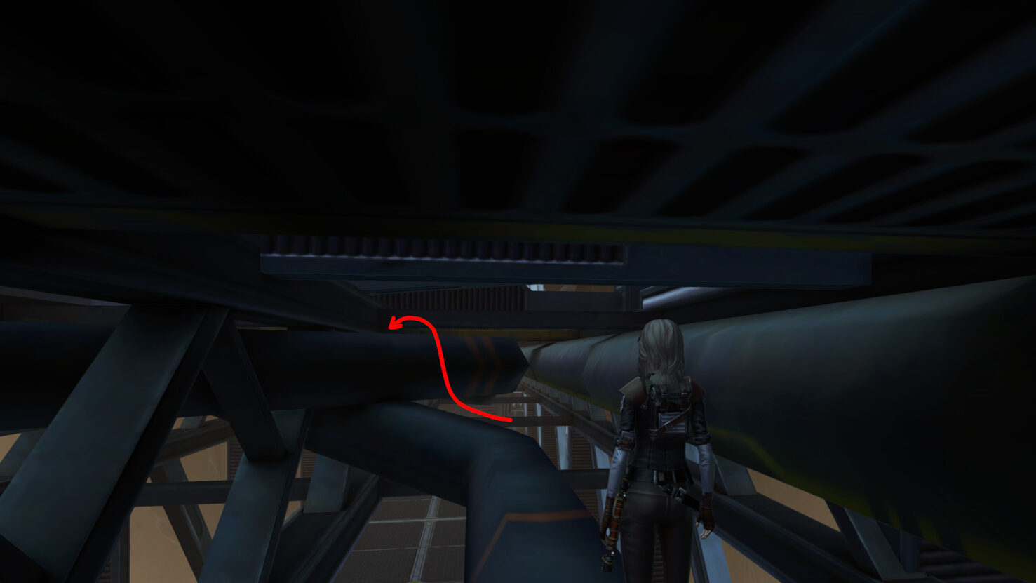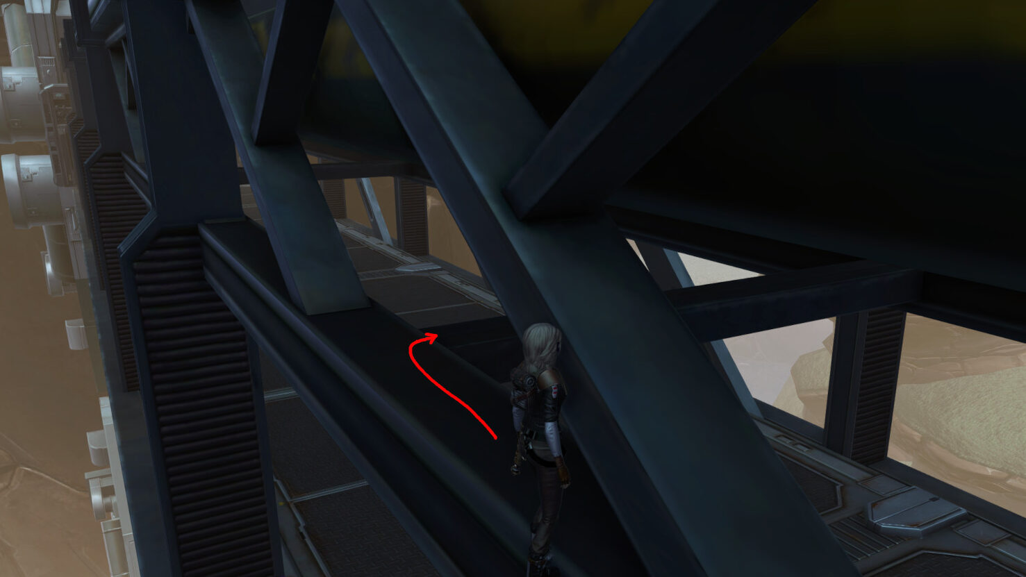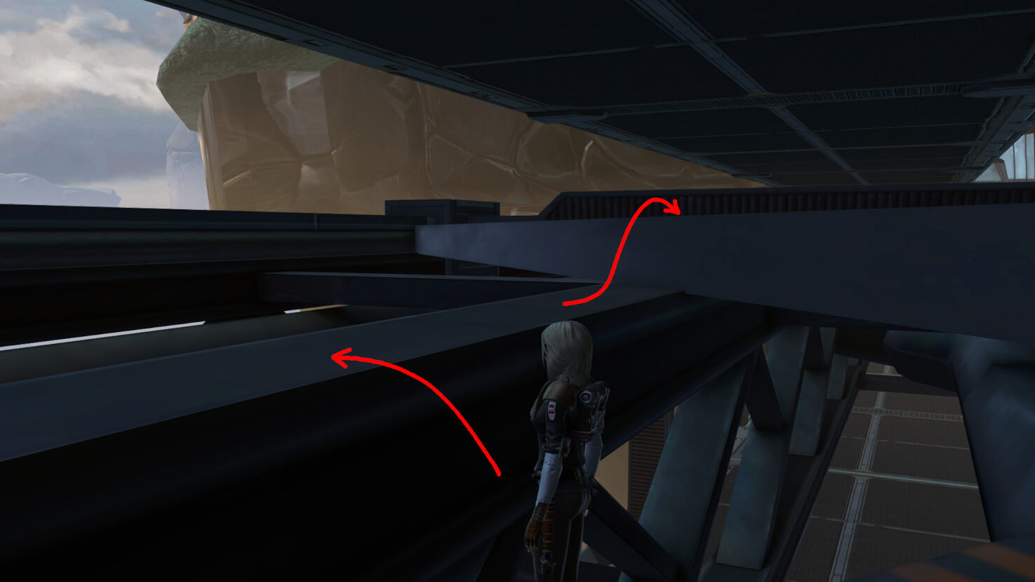 At the end of the walkway, you have to climb the last beam on the right side. Important Note: You can not climb this if you are above Body Type 2 for either gender.