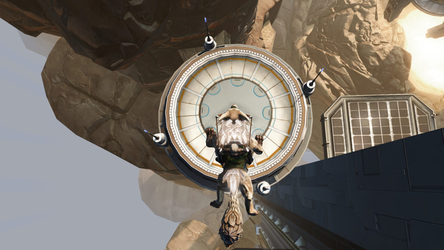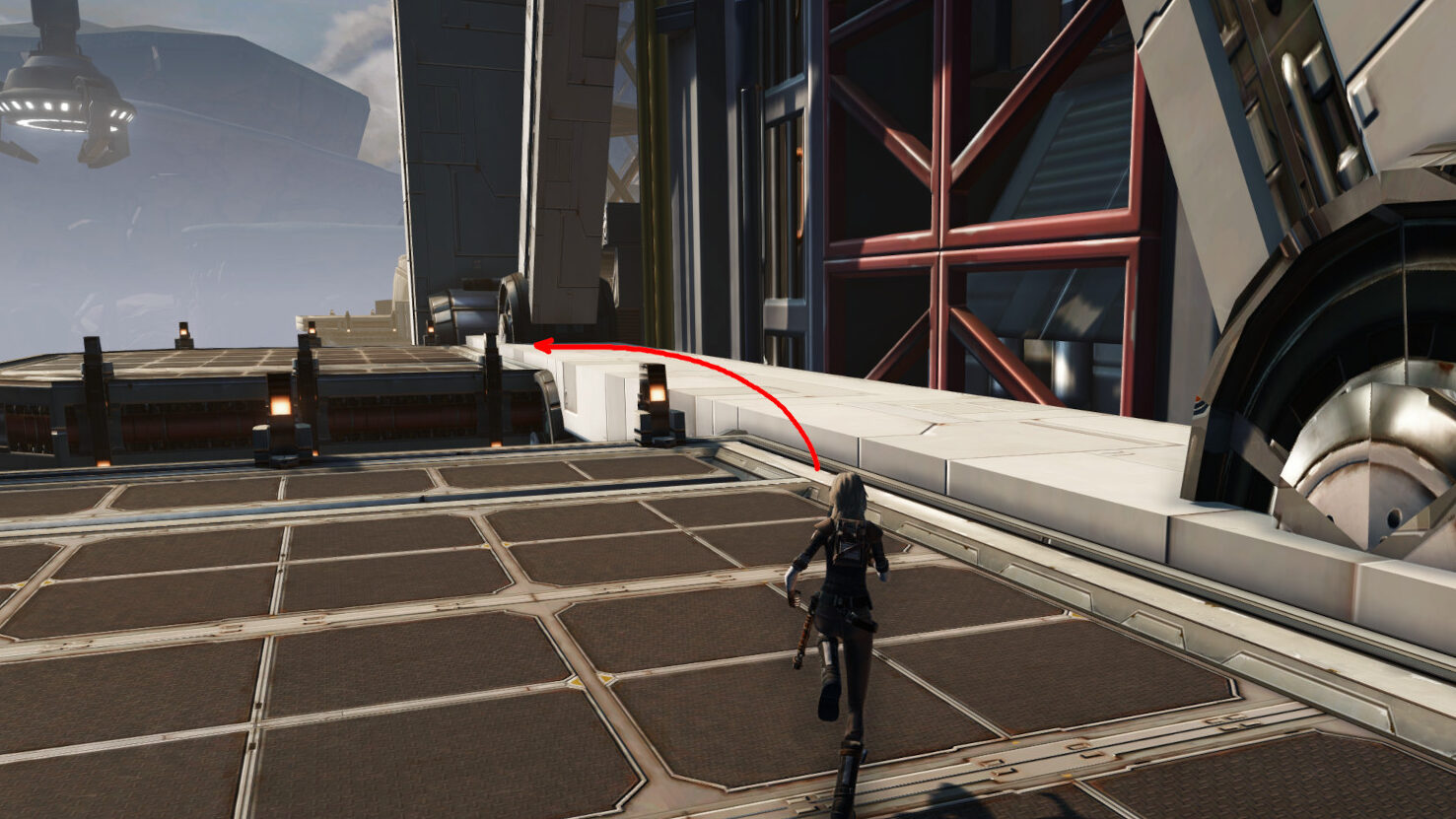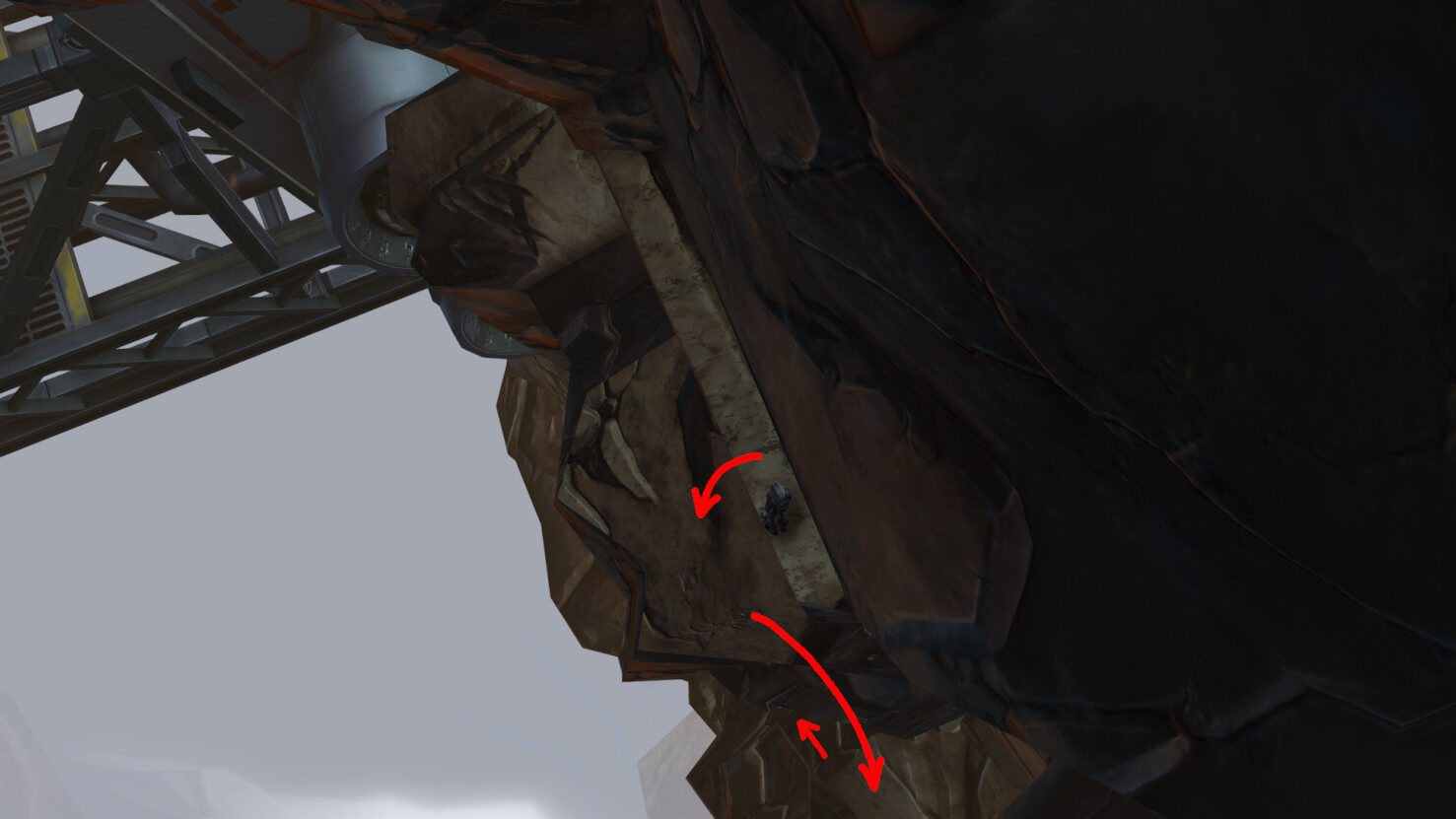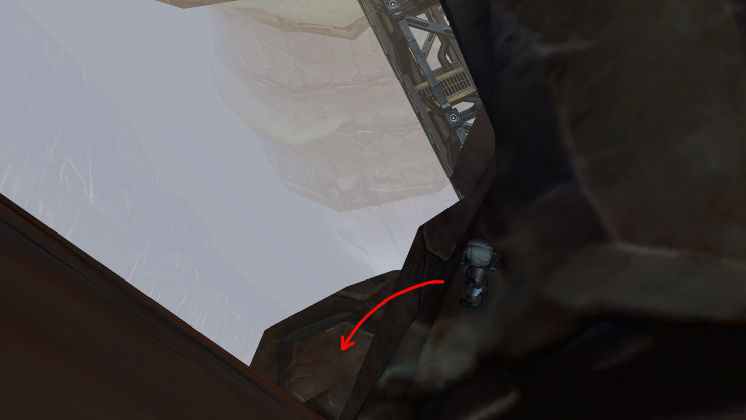 When the platform reaches the top, use a mount again to jump to the dark gray platform below attached to the structure.