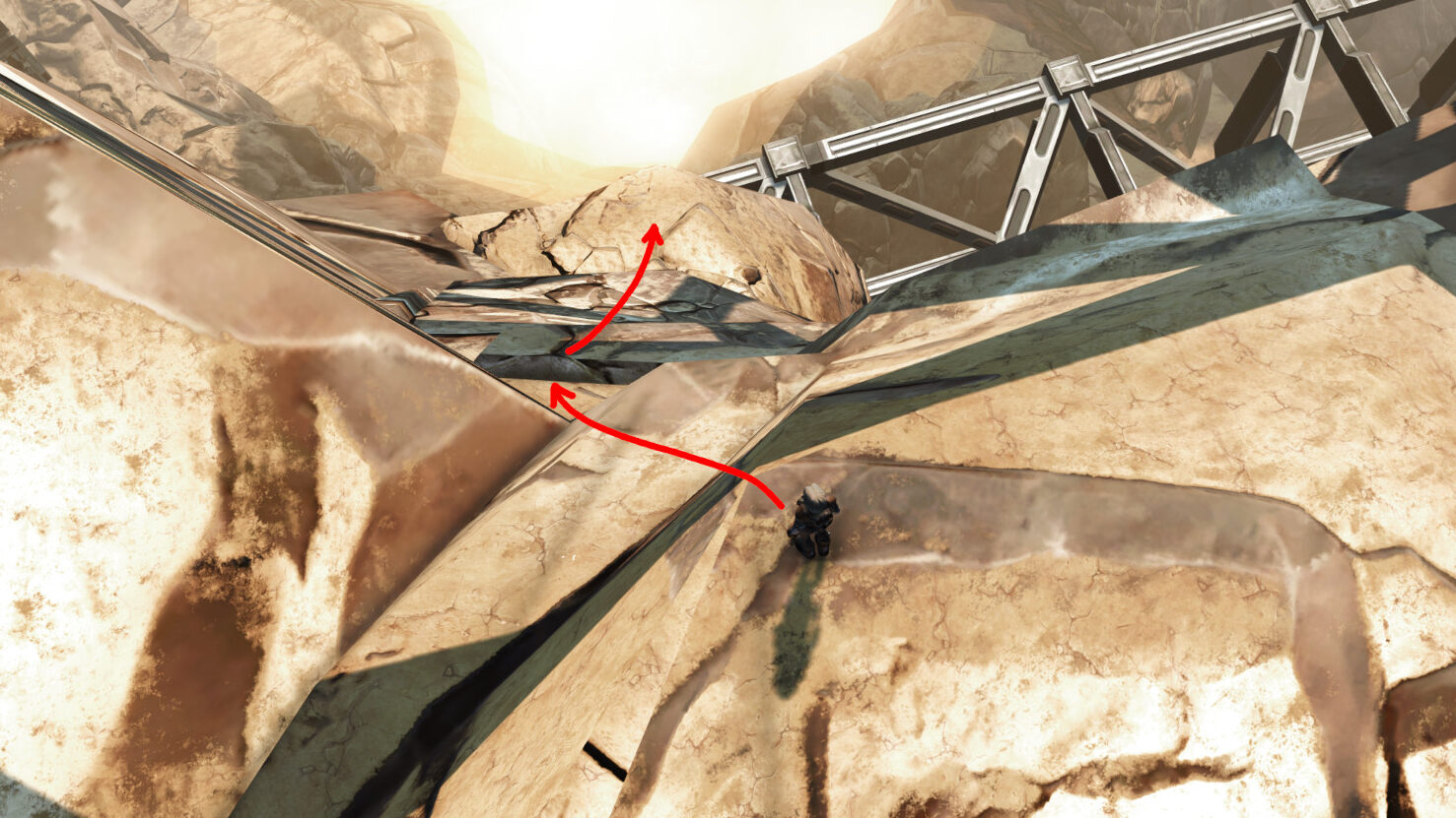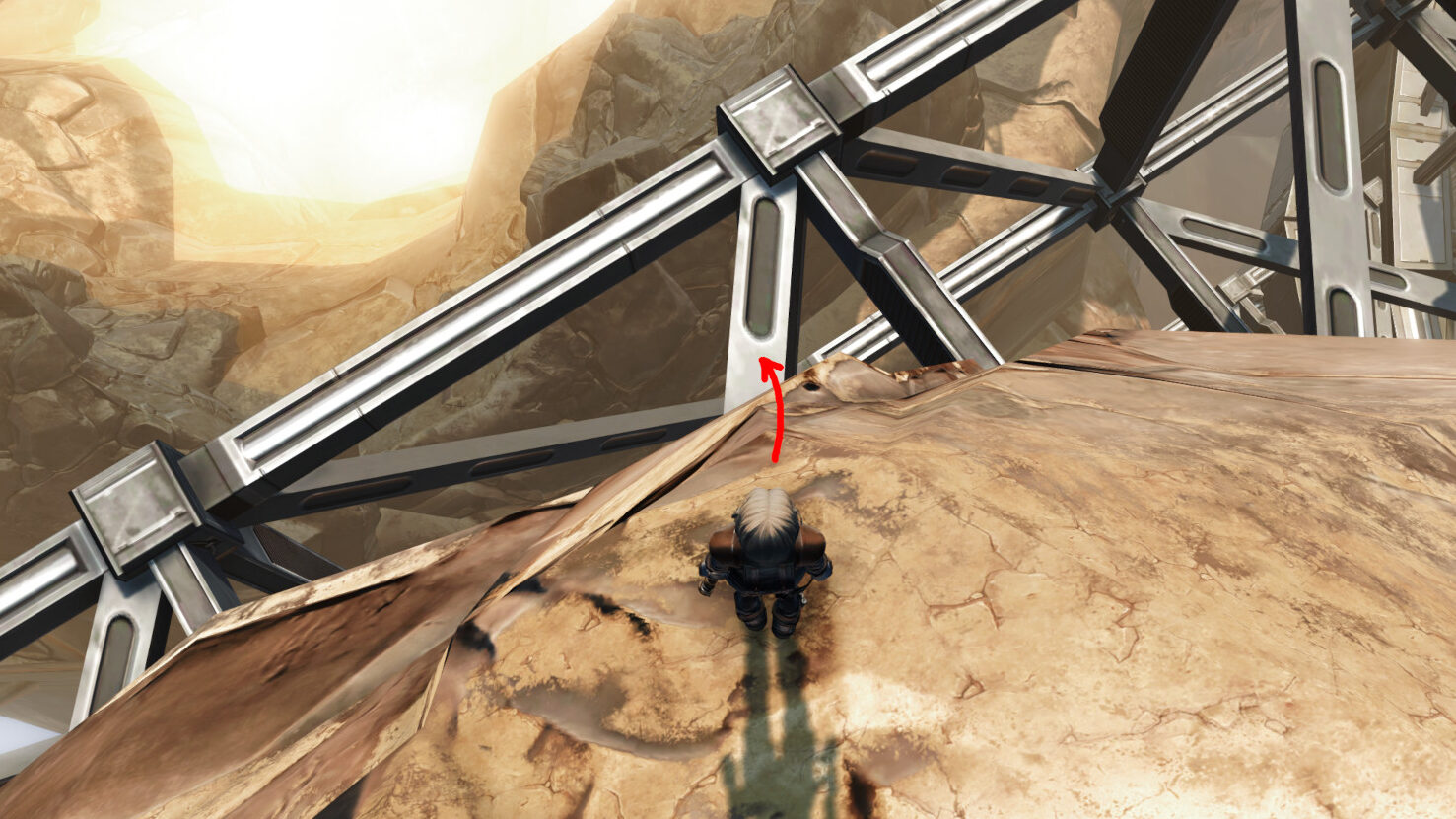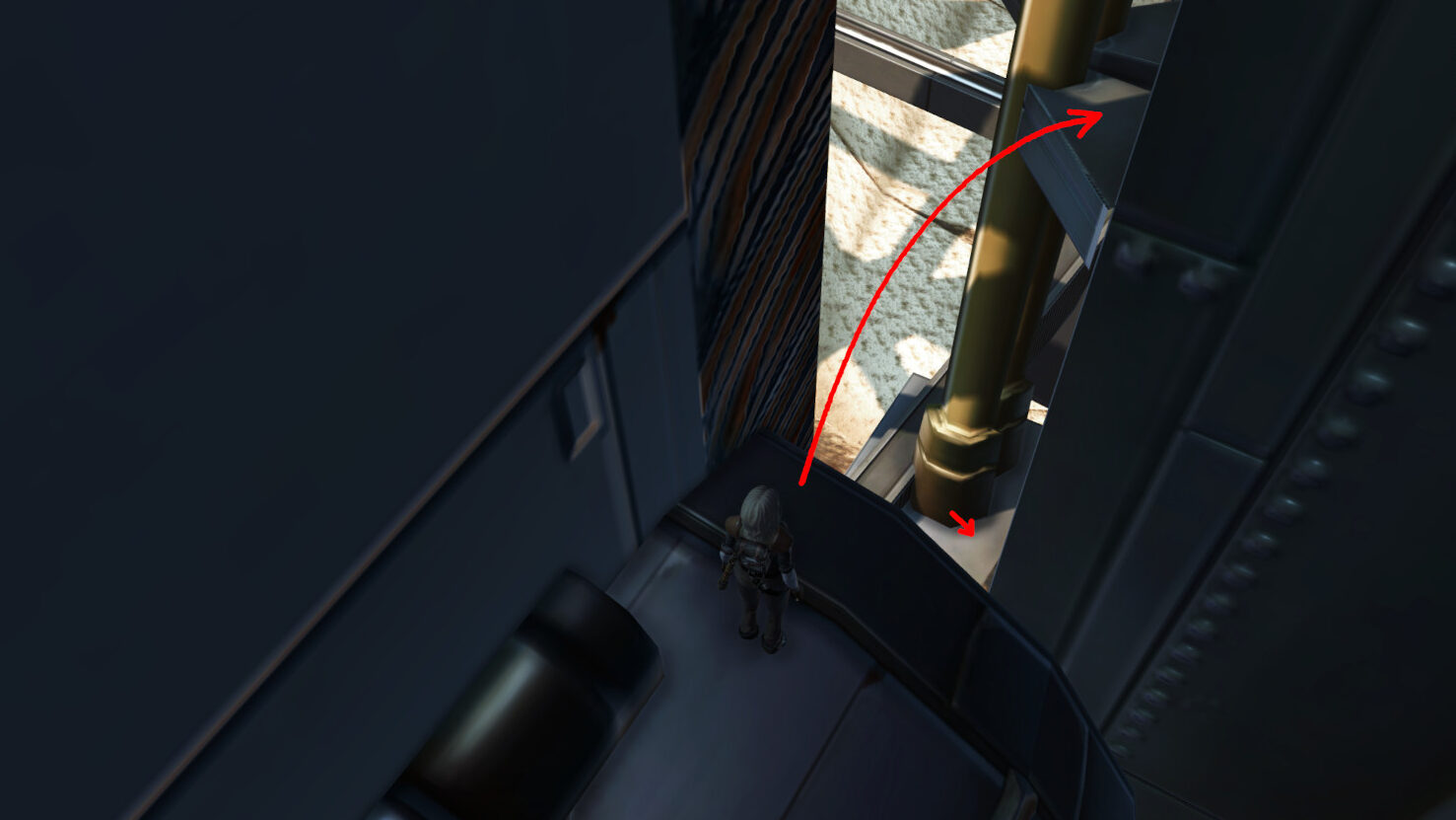 Jump onto the next crossbeam from the pipe and turn right to the diagonal beam and move to the edge.