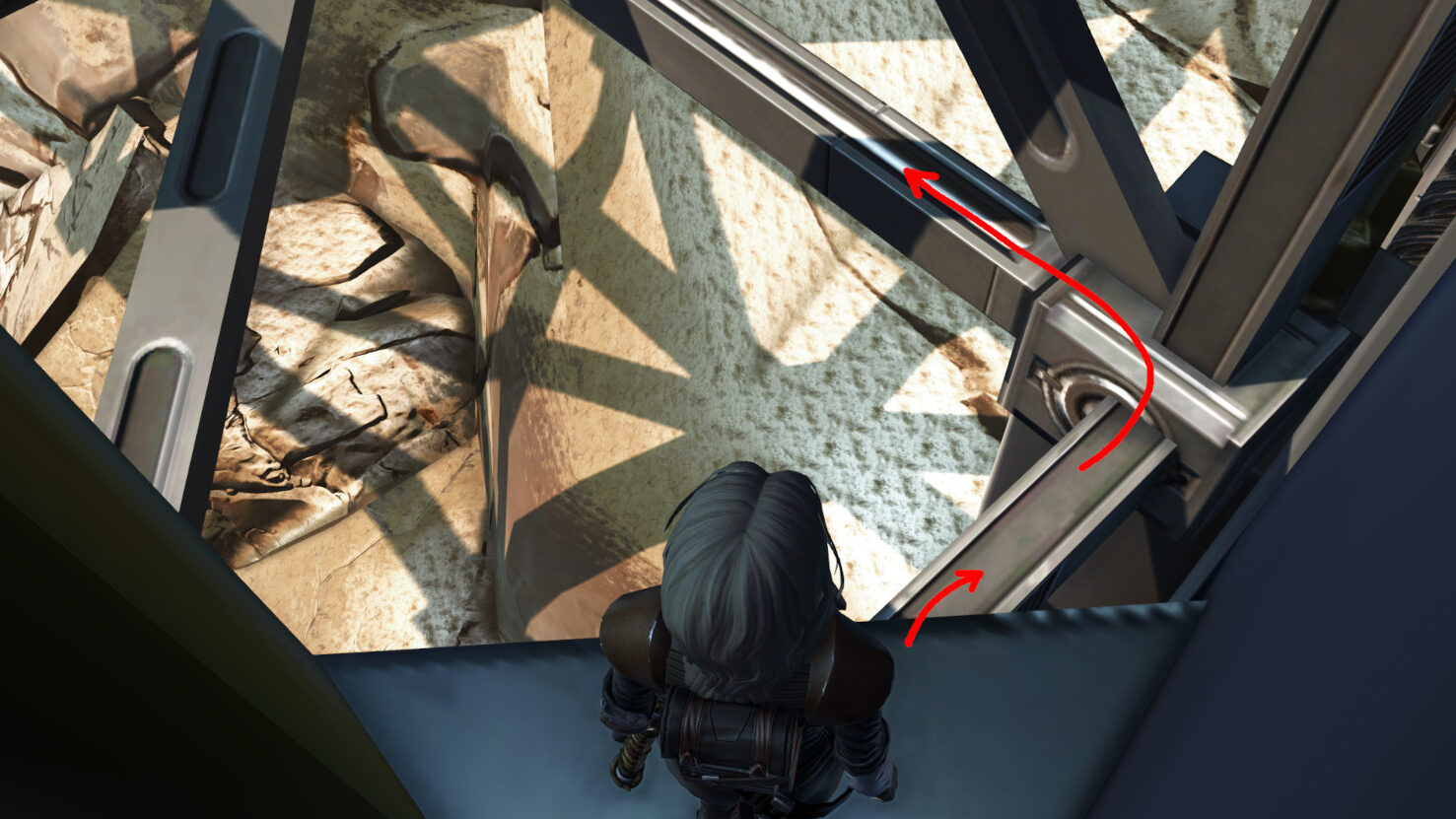 Parallel yourself to the beam below and jump down. Be sure to jump, or you might glide down the wrong side.