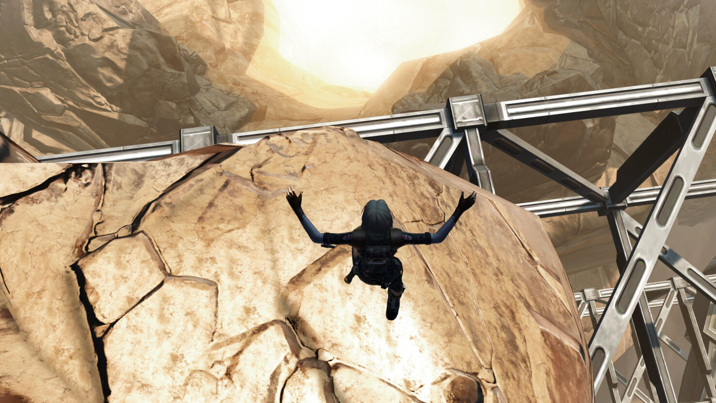 Midway up the beam you will realise why you have to do this on a small body size character, so you can pass the crossbeam it's attached to. Face the crossbeam, jump and move forward. Be sure to not move before you jump, because you might bounce off. From the very narrow ledge, move in on the crossbeam to your left.