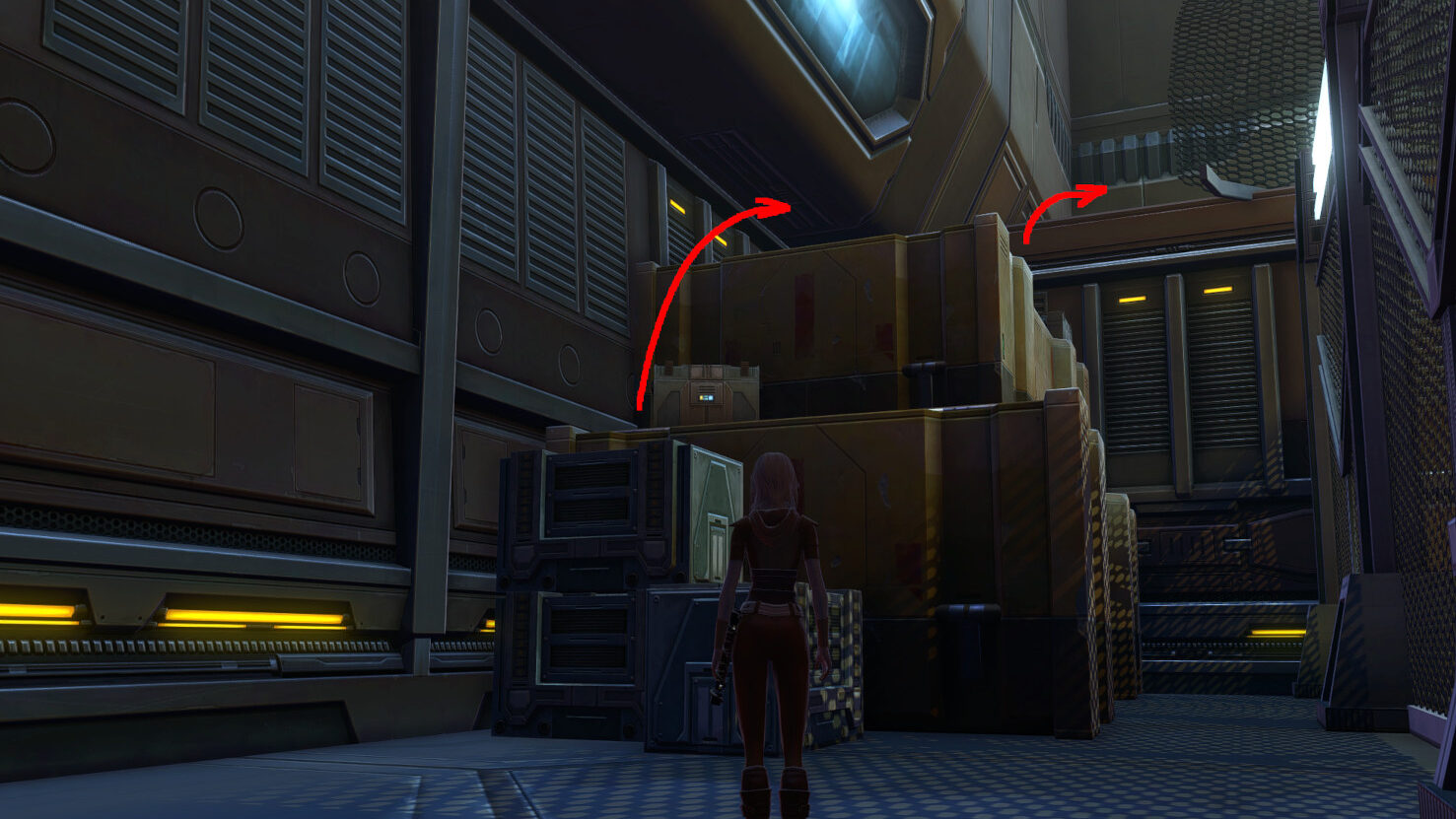 As you pass this narrow catwalk, you will find what looks like a Datacron to your right on the other side. This is not the Datacron you are looking for. Turn left instead and climb the crates.