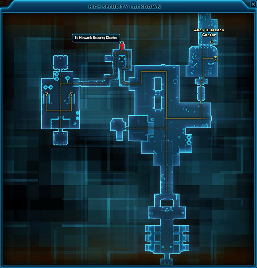 To get to Network Security District, you have to take the path north from Network Security Lockdown, as shown on the map.