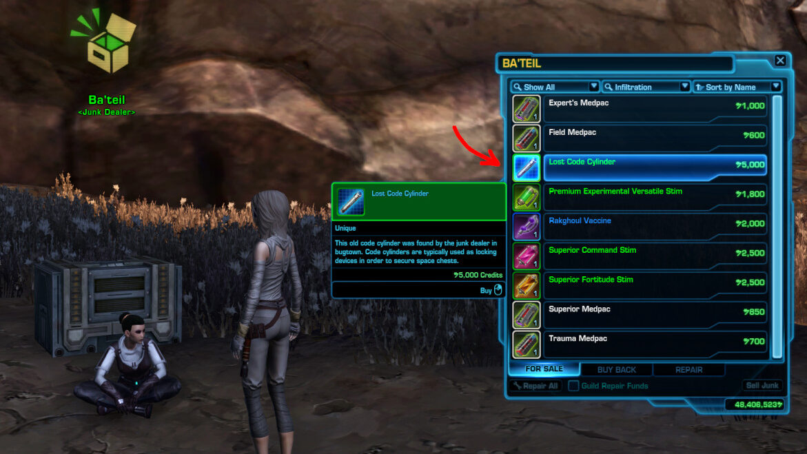 This vendor sells the Lost Code Cylinder for 5000 credits. If you travel as a group, only one needs to purchase this.