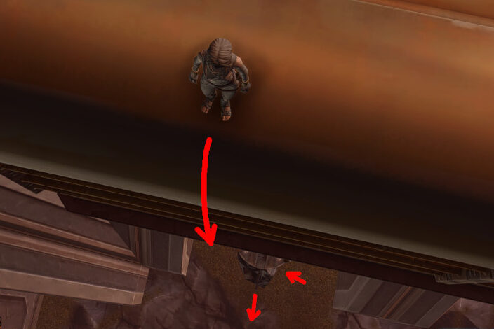 This might be an easy drop. Stand at the edge and again look down to see where the little moving droid will come out from. You will be directly above the pipe it's coming out from.
