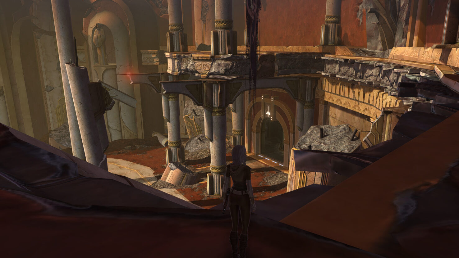 The Red Mastery Datacron is located on the broken second floor of the ruined Jedi Temple. Your starting point is a massive broken pillar on the left side of the room that leads to the second floor.