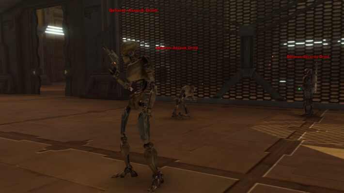 You will find the Beharen Security Droids quite rarely. They will be the toughest to find, because they usually will only be found in a fresh instance. They will be located in a fenced area in Labor Valley on Corellia, behind a group of Damaged Scanner and Security Droids.