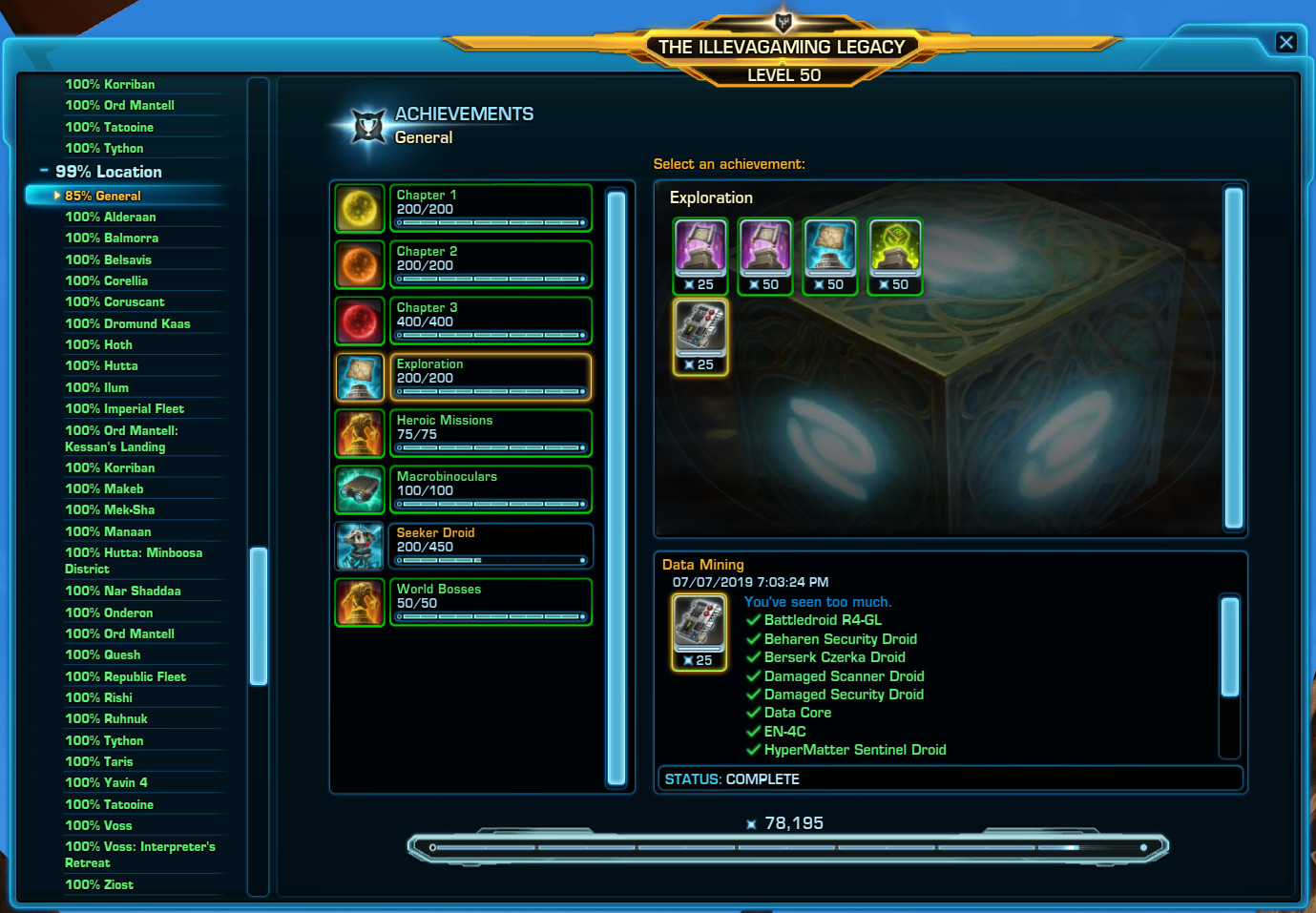 The Data Mining achievement in Star Wars: The Old Republic is a lighthearted nod to the practice of uncovering hidden game data, humorously described with the tagline "You've Seen Too Much". To earn this achievement, players must locate and defeat a series of rogue data-gathering droids scattered across the galaxy. These droids range from standard weak enemies found in the open world to tougher opponents hidden within Flashpoints, World Boss encounters, and even an Operation boss. This guide provides the exact locations and details for each target to help you efficiently complete the Data Mining achievement and uncover what you were never meant to see.