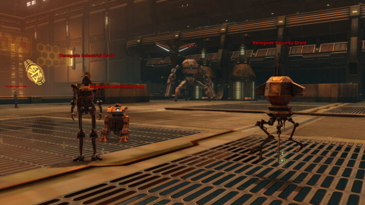 The weak Renegade enemies surrounding the area where you find the Nar Shaddaa World Boss Battledroid R4-GL in Network Security District, are the droids you're looking for this time. They will often be part of the Feast of Prosperity event as well, if that is the route you'll take.