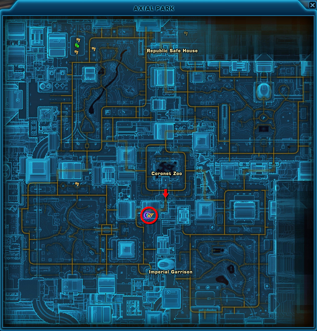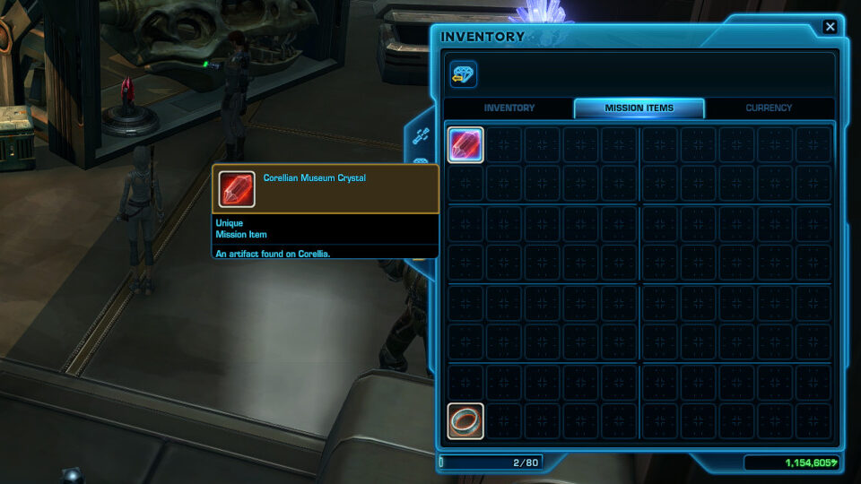 Then you need to pick up an item in Axial Park on Corellia called Corellian Museum Crystal. You will find this little red crystal artifact in a large crate with a large skull inside surrounded by yellow enemies (they won't attack unless you attack) in a tunnel going south from Coronet Zoo. The item will be transferred to your Mission Item inventory. This item is required to even interact with the final door, where your Datacron is locked behind. Coordinates: 687, -2199.