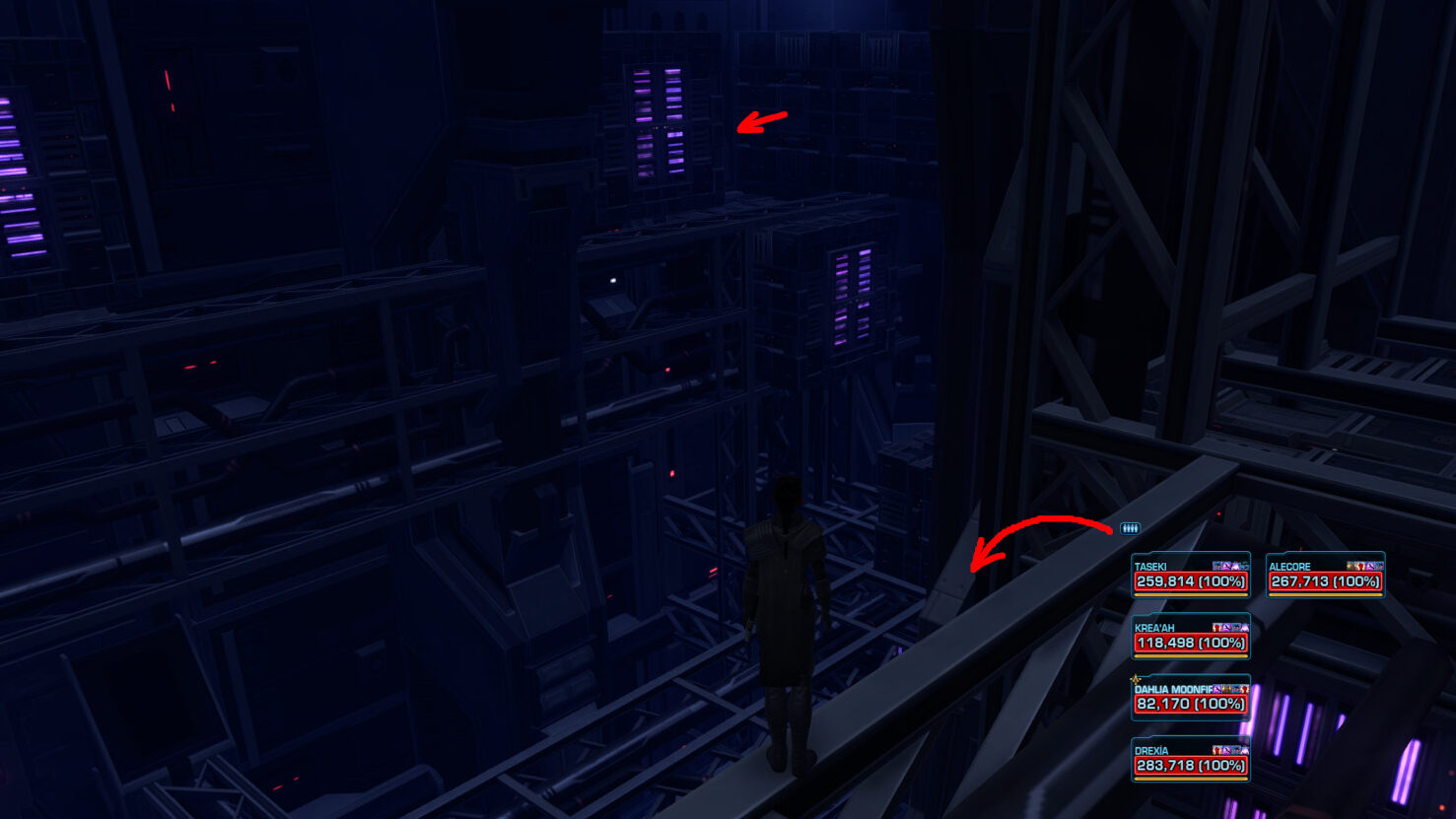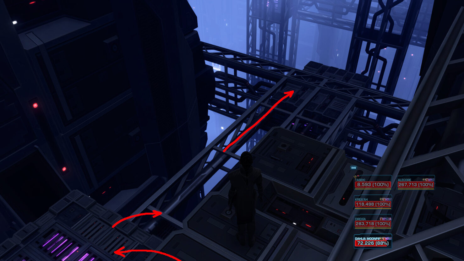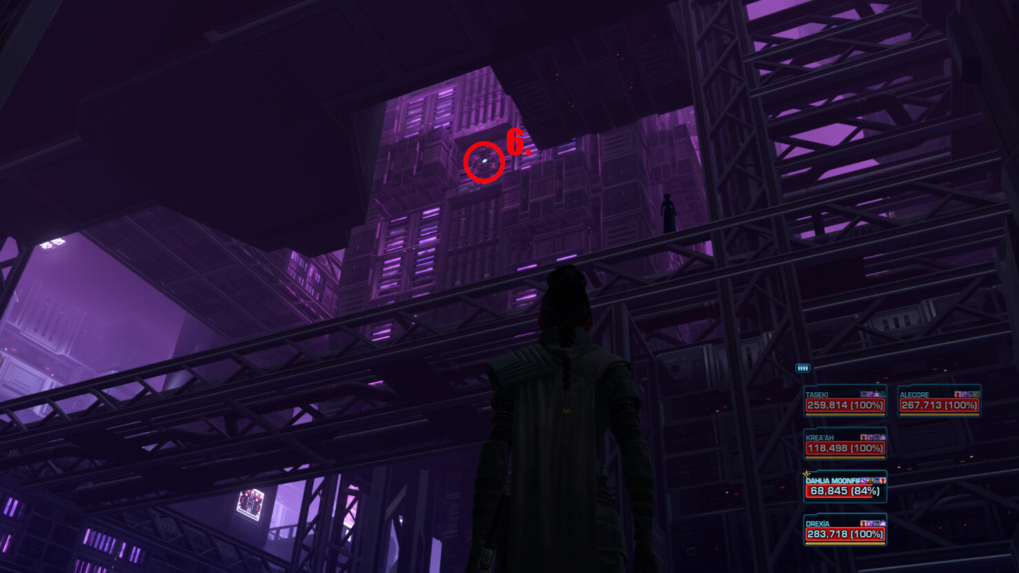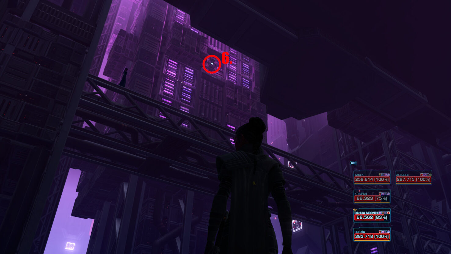 If there are any additional players along, they should jump down to the pipes below to get closer to position 7. and then simply grapple to the Magnetic Stabilizer above the door as soon as it is available.