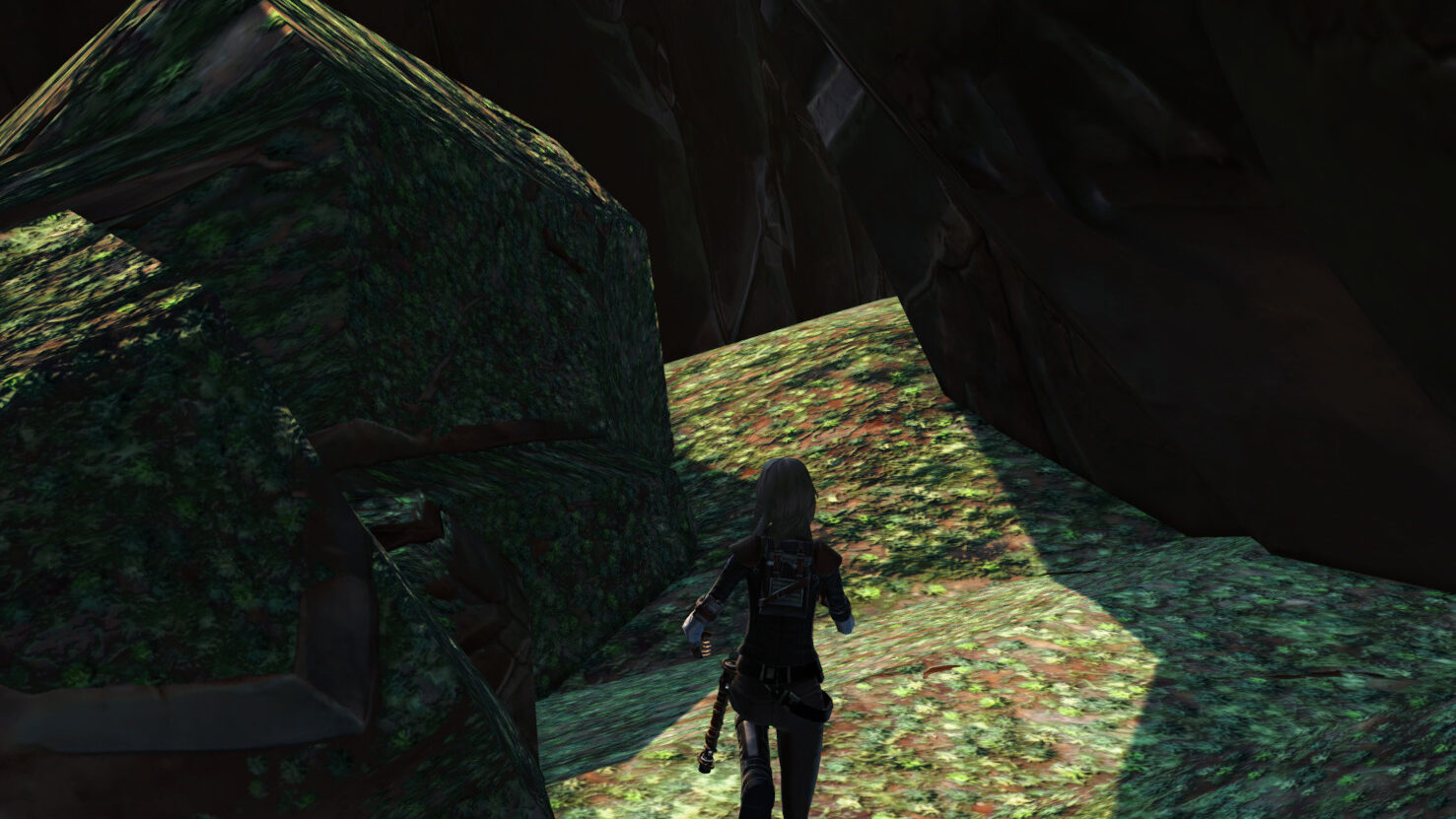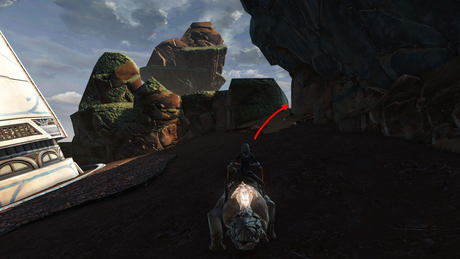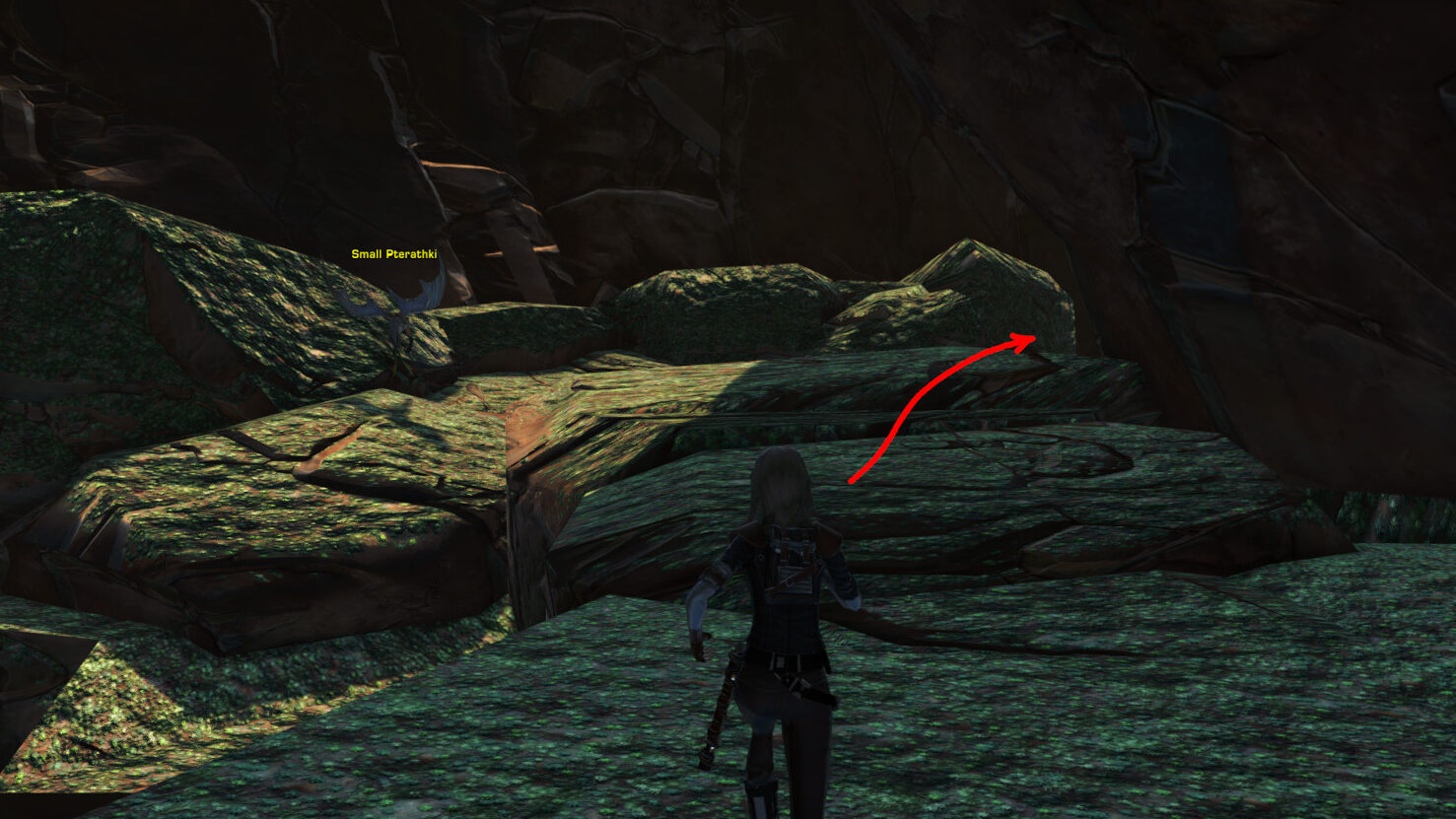 As you pass the boulder, run through the small gap in the rocky wall behind it.