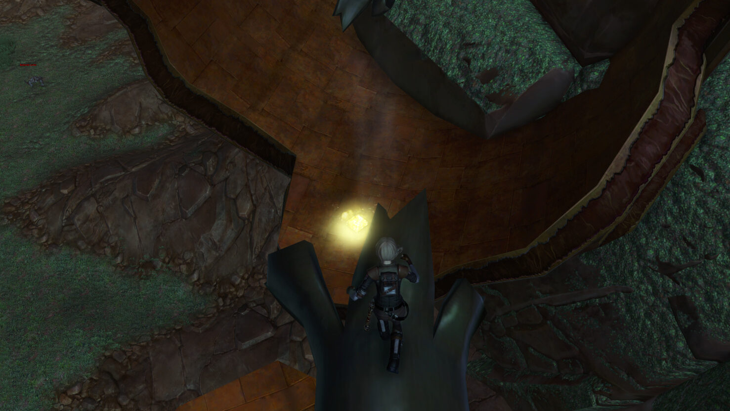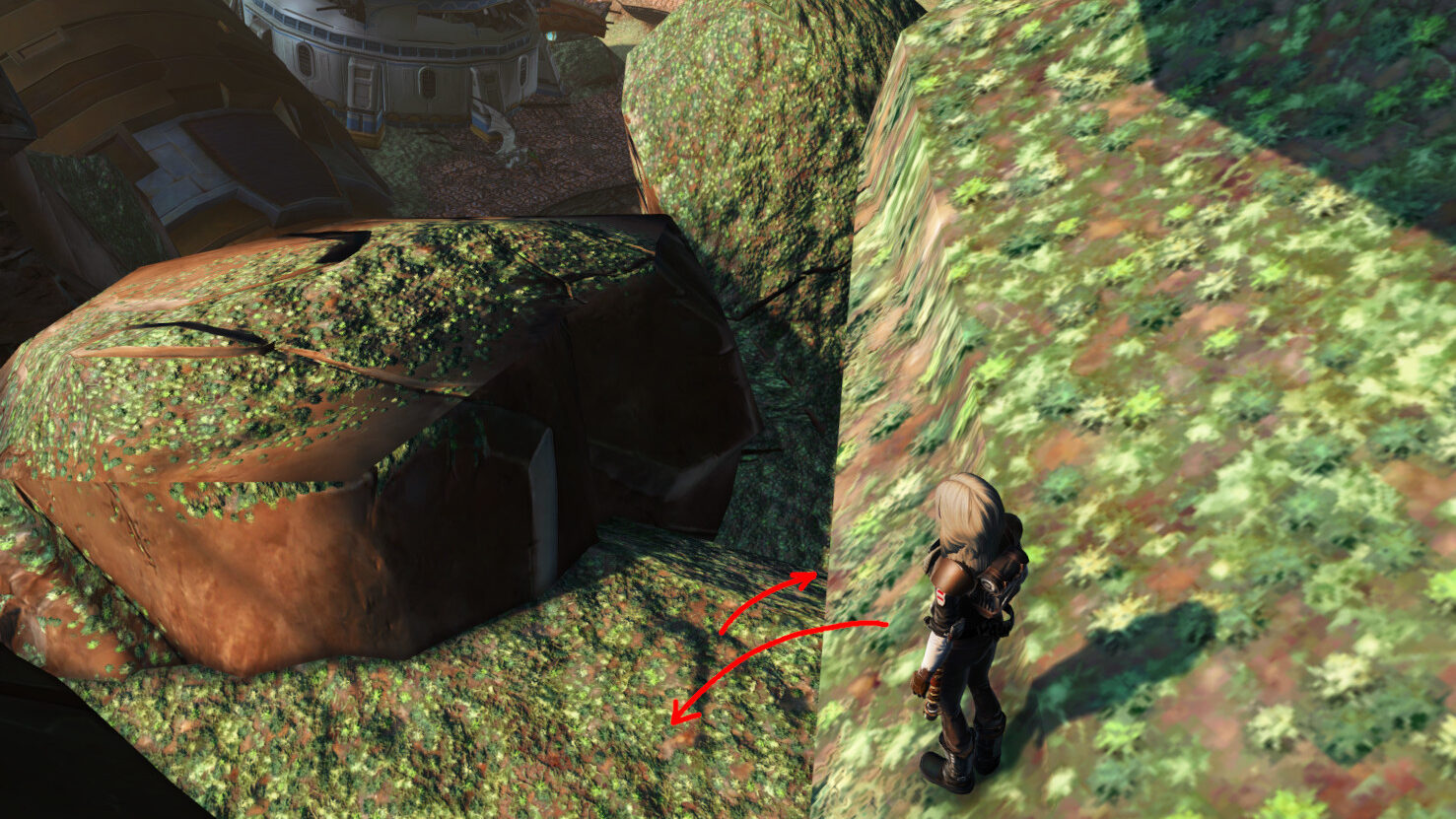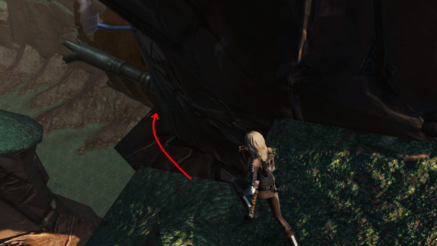 Follow the wall until you reach the small gap between the grassy rock and the wall on your right.
