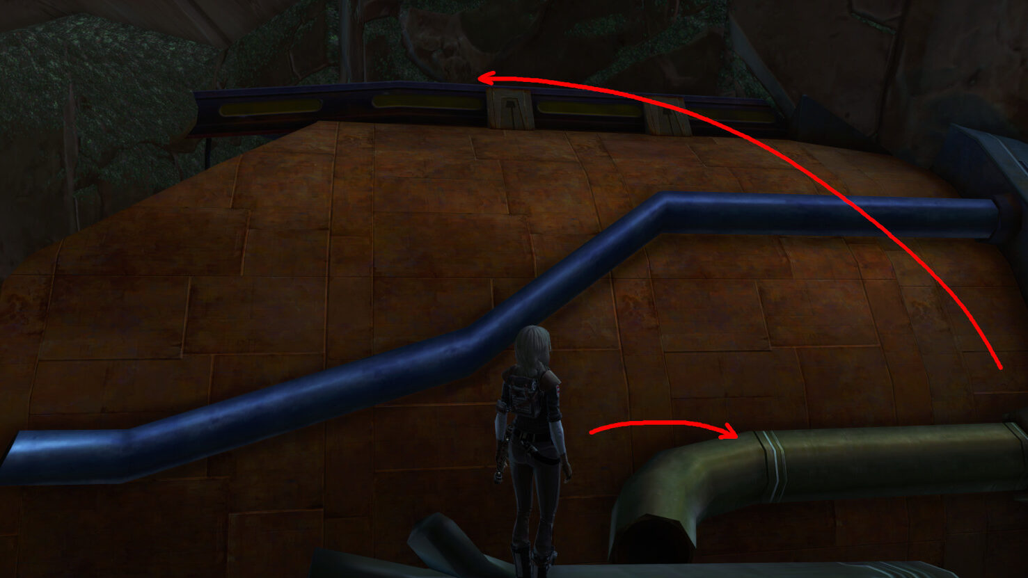 Jump to the small bronze pipe attached to the big orange pipe and shimmy your way on top of it.