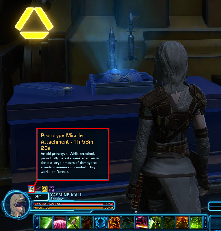 This will enable the opportunity to click this table as often as you want to gain a Prototype Missile Attachment buff that lasts for 2 hours, which "while attached, periodically defeats weak enemies or deals a large amount of damage to standard enemies in combat." The buff will only work on Ruhnuk and you will lose it if you die, travel to your personal Stronghold or switch instance.