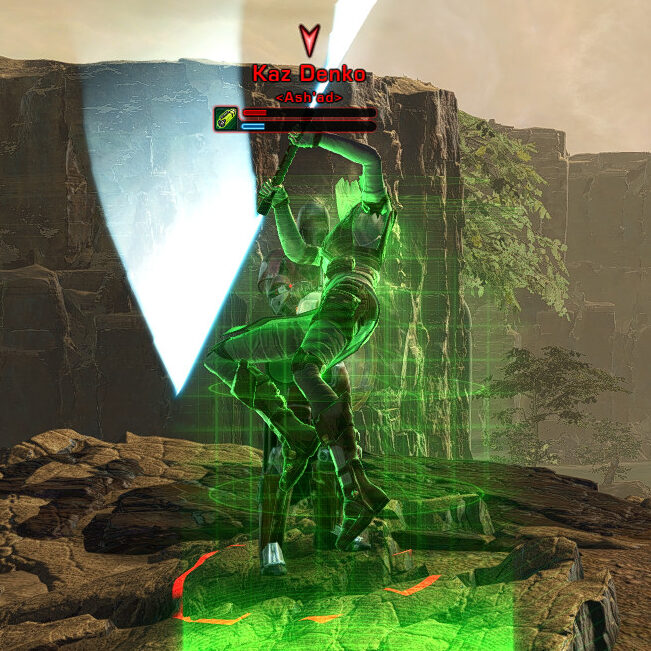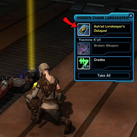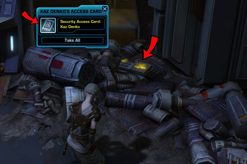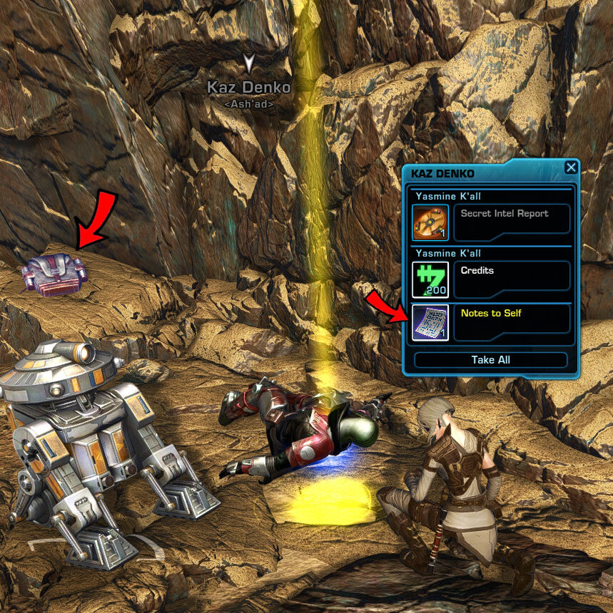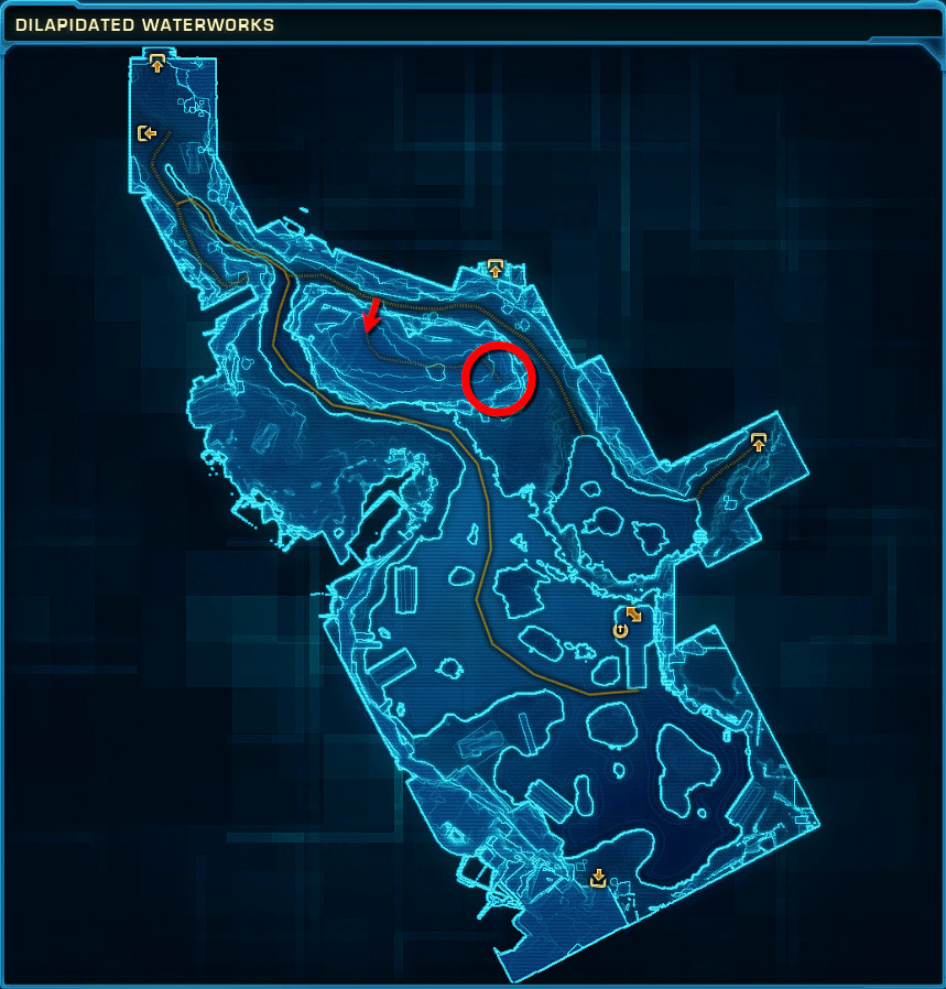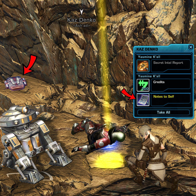 Once you've looted the Ash'ad Datapad, you have to find the location of Kaz Denko's Hiding Place. His hiding place is at the top of a small path overlooking the Dilapidated Waterworks where you will be ambushed by Kez Denko, a weak NPC.
