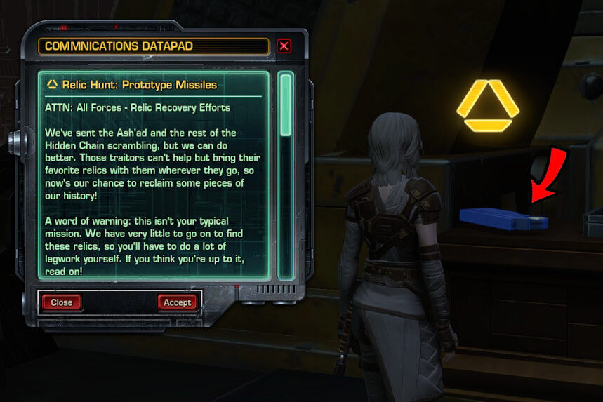 This is a guide on how to initiate the "Relic Hunt: Prototype Missiles" mission that is part of the Ruhnuk Datacron achievement in SWTOR.
