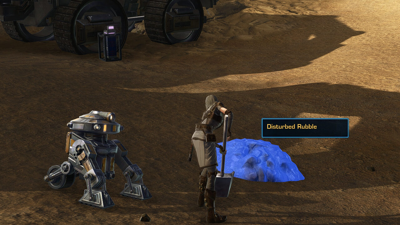 Next up you have to Search the Excavation Site. There will be several clickable Disturbed Rubble piles, but from experience you have to dig up a specific pile marked on the map. When you dig at the correct pile, a pack of Opportunistic Tinebacks will ambush you.