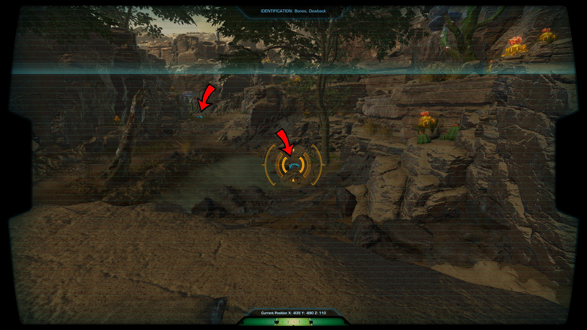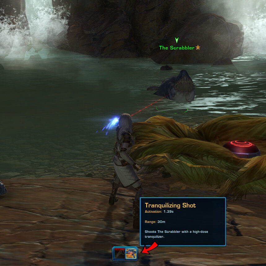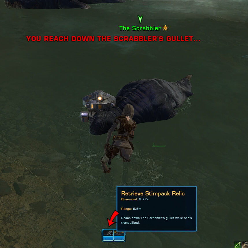 Once the Scrabbler appears, it will run hectically around its nest. Simply approach it, target the Scrabbler and click the Tranquilizer icon to put it to sleep. Once it's tranquilized, click the second icon to Retrieve the Stimpack Relic in the Scrabbler's gullet.