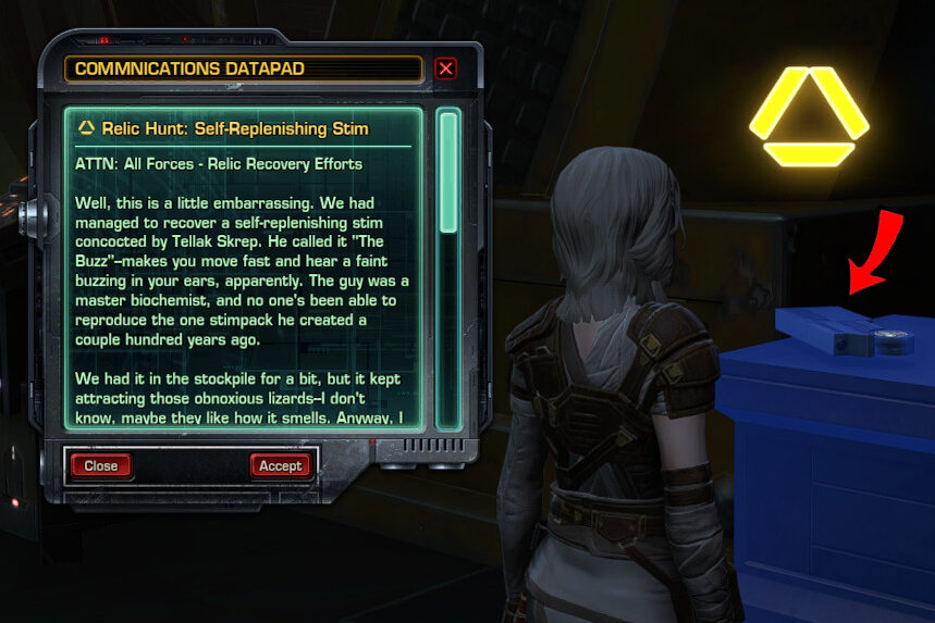This is a guide on how to initiate the "Relic Hunt: Self-Replenishing Stim" mission that is part of the Ruhnuk Datacron achievement in SWTOR.