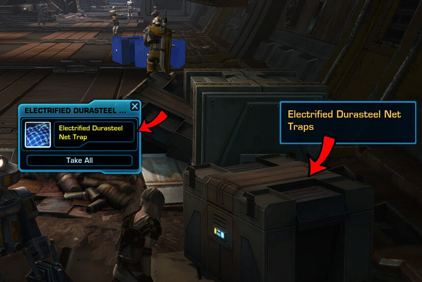 1/3 Trap Component is an Electrified Durasteel Net Trap found in some crates just outside the room of Mandalore's Encampment.