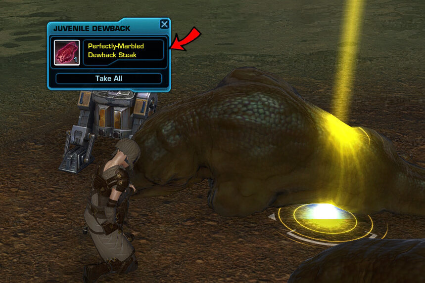 3/3 Trap Component is a Perfectly-Marbled Dewback Steak looted from Juvenile or Wild Dewbacks found in Western Ruhnuk. A good spot to hunt these creatures is in the Verdant Ravine outside of Outpost Delta Travel Point.