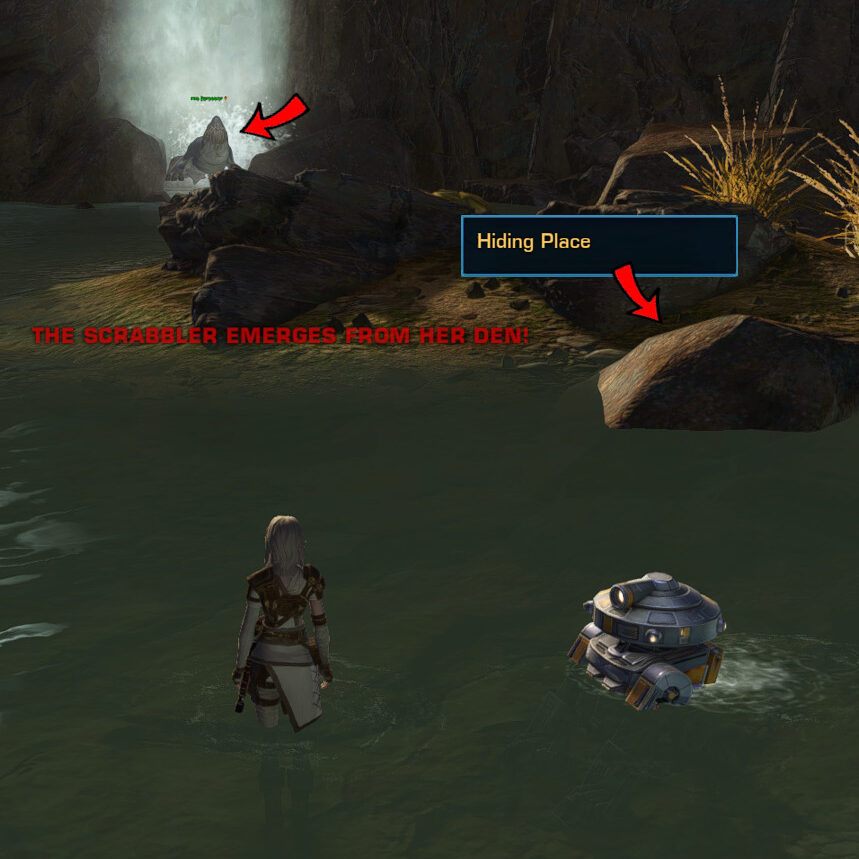 Place the trap in one of the three nests, then retreat past one of the stones marked as "Hiding Place" and wait for the Scrabbler to appear.