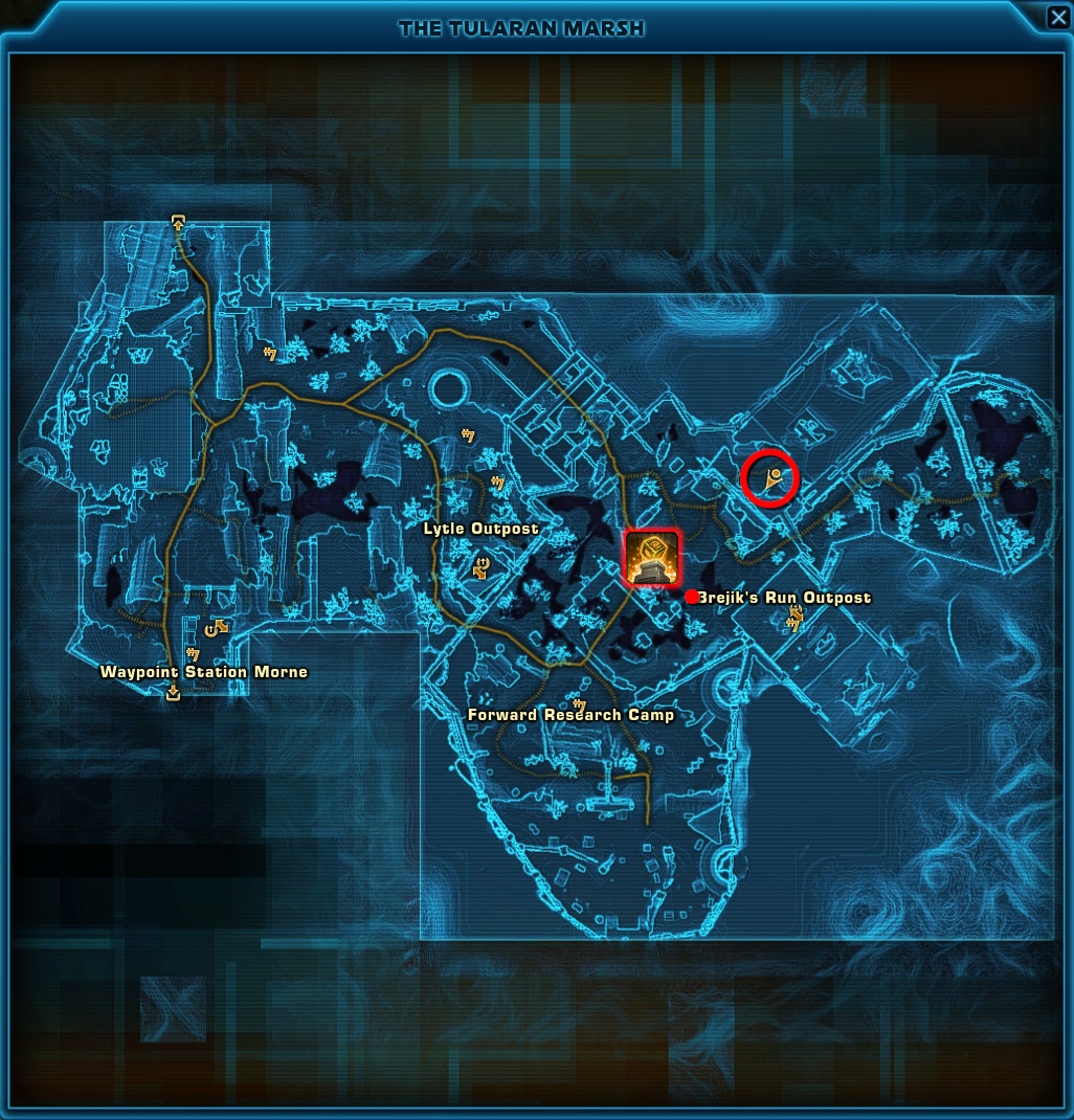 The Orange Mastery Datacron is located on a broken platform near the Derelict Swoop Tracks in the Tularan Marsh. This is quite the long way around to get to the Datacron's location with a bit of a jumping puzzle. You start by climbing a pipe right next to the Derelict Swoop Tracks. This is exactly the same location as the Imperial Blue Mastery Datacron version, so be sure you are on the correct faction.
