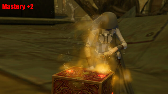 The Orange Mastery Datacron increases your aptitude in combat, allowing you to do more damage. It will grant you Mastery +2 to your permanent stats along with codex: Galactic History 24: Empress Teta. There are 5 Datacrons in total located on the planet of Taris.