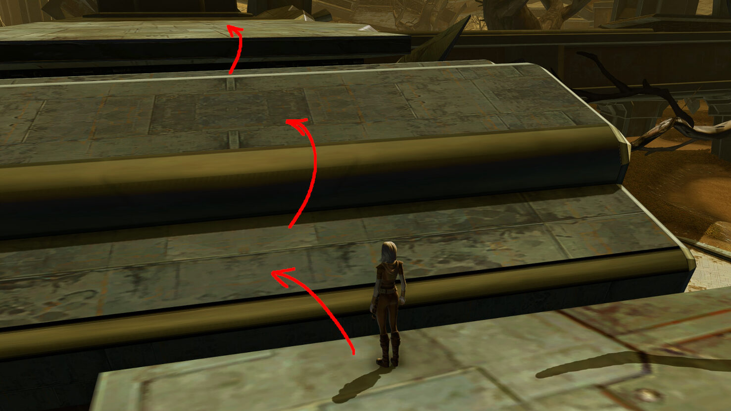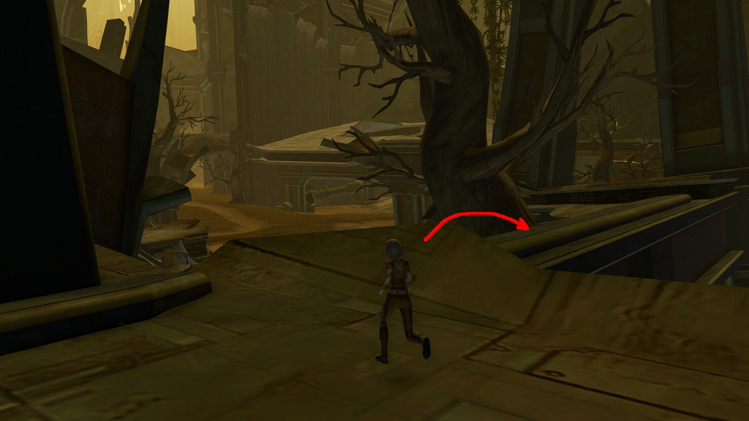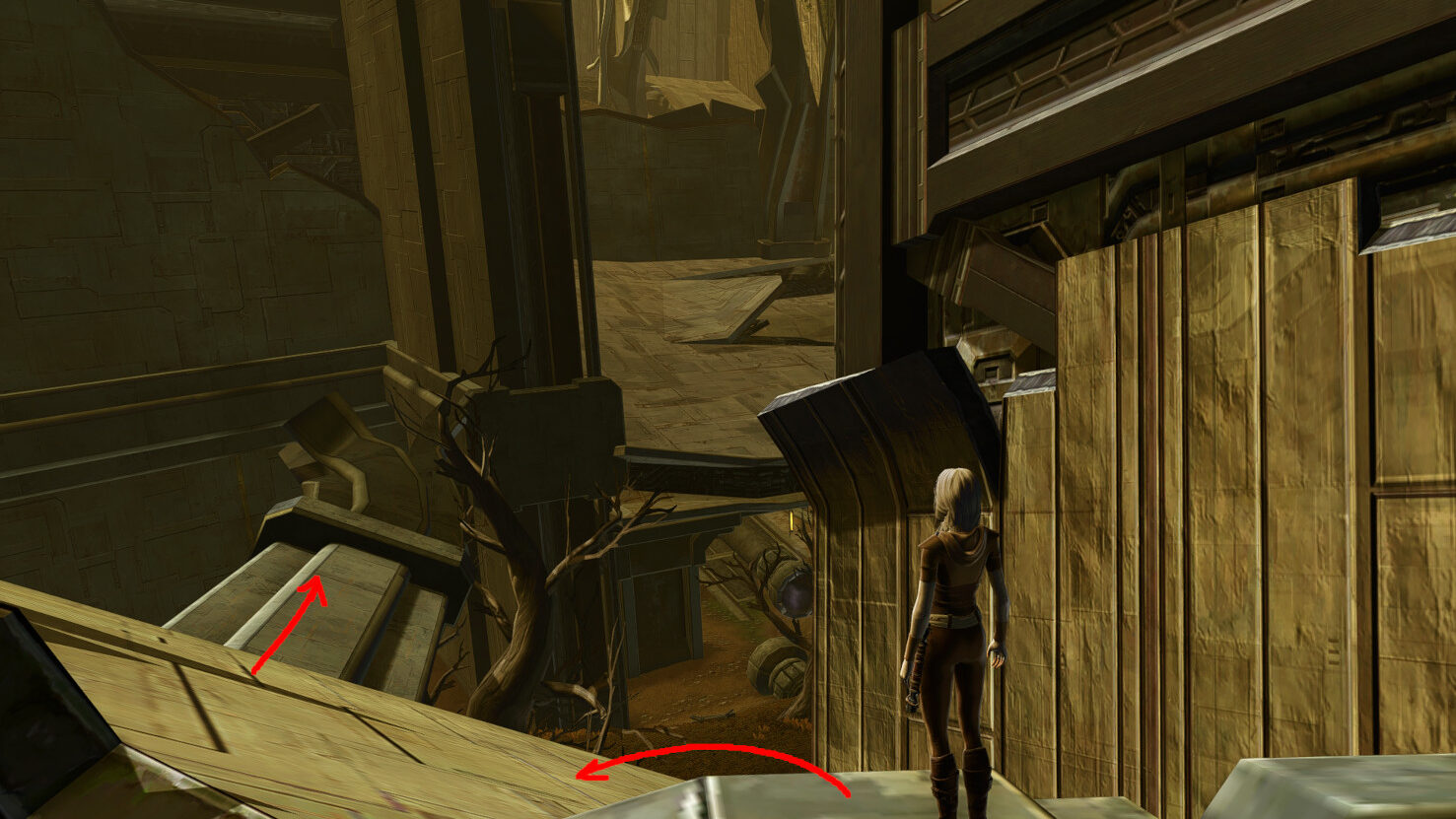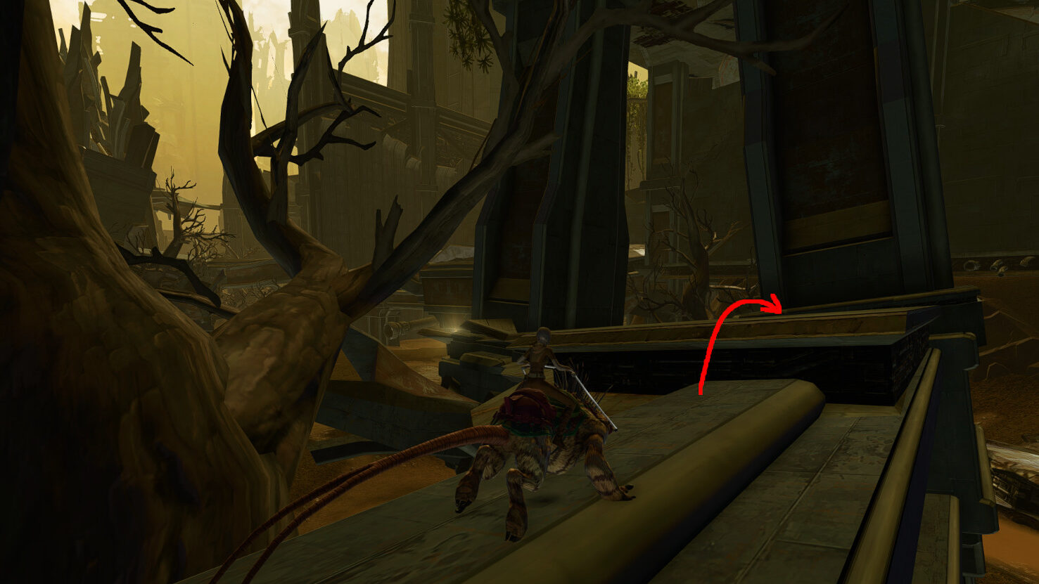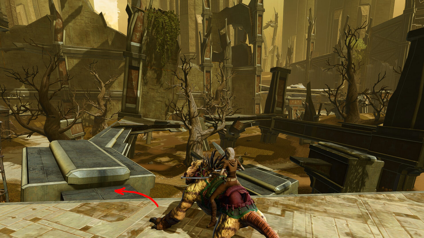 Once you get to the end of this long platform, turn right and jump down to the next bit of broken support beams. I especially recommend a mount here, since the jump is a bit farther than usual.